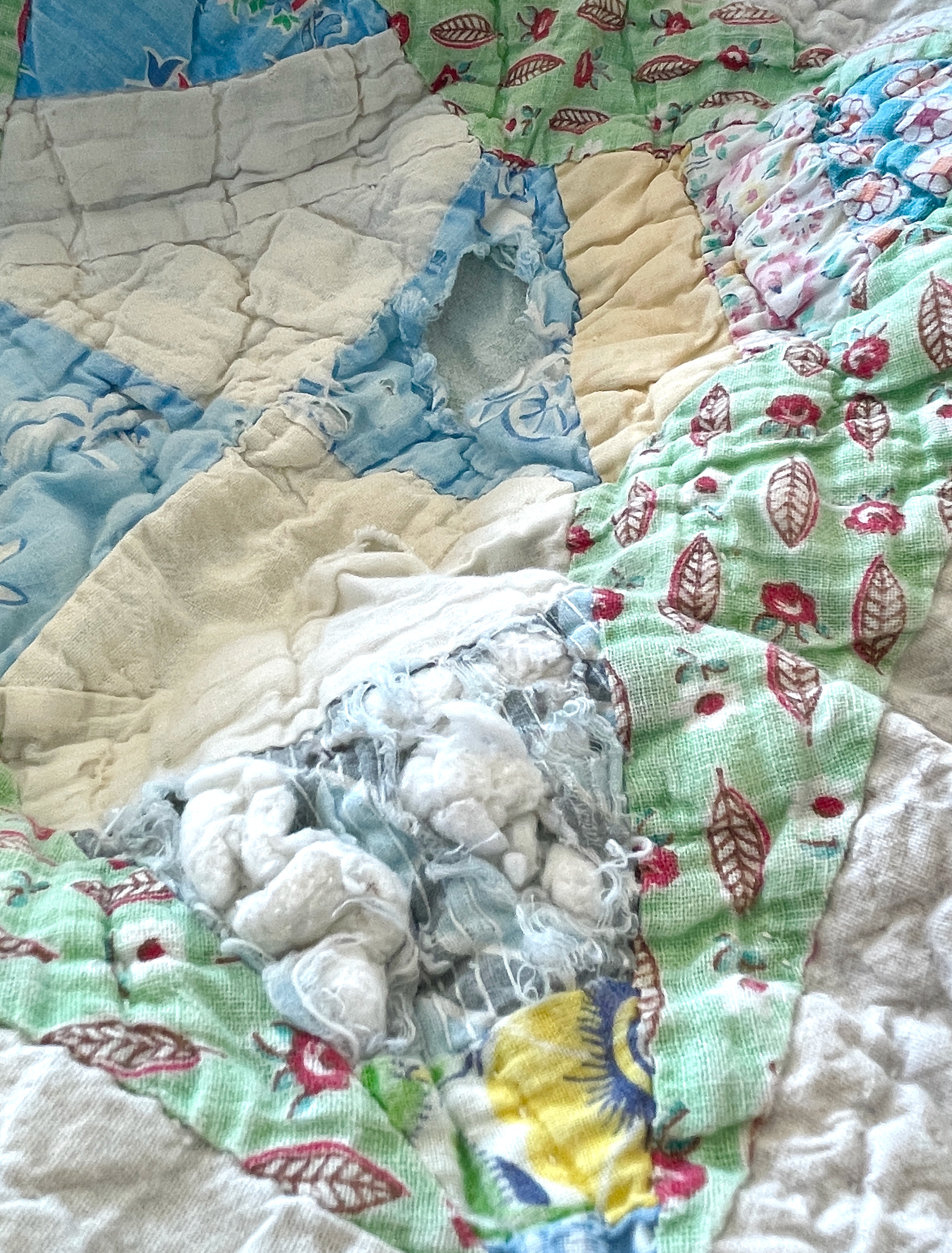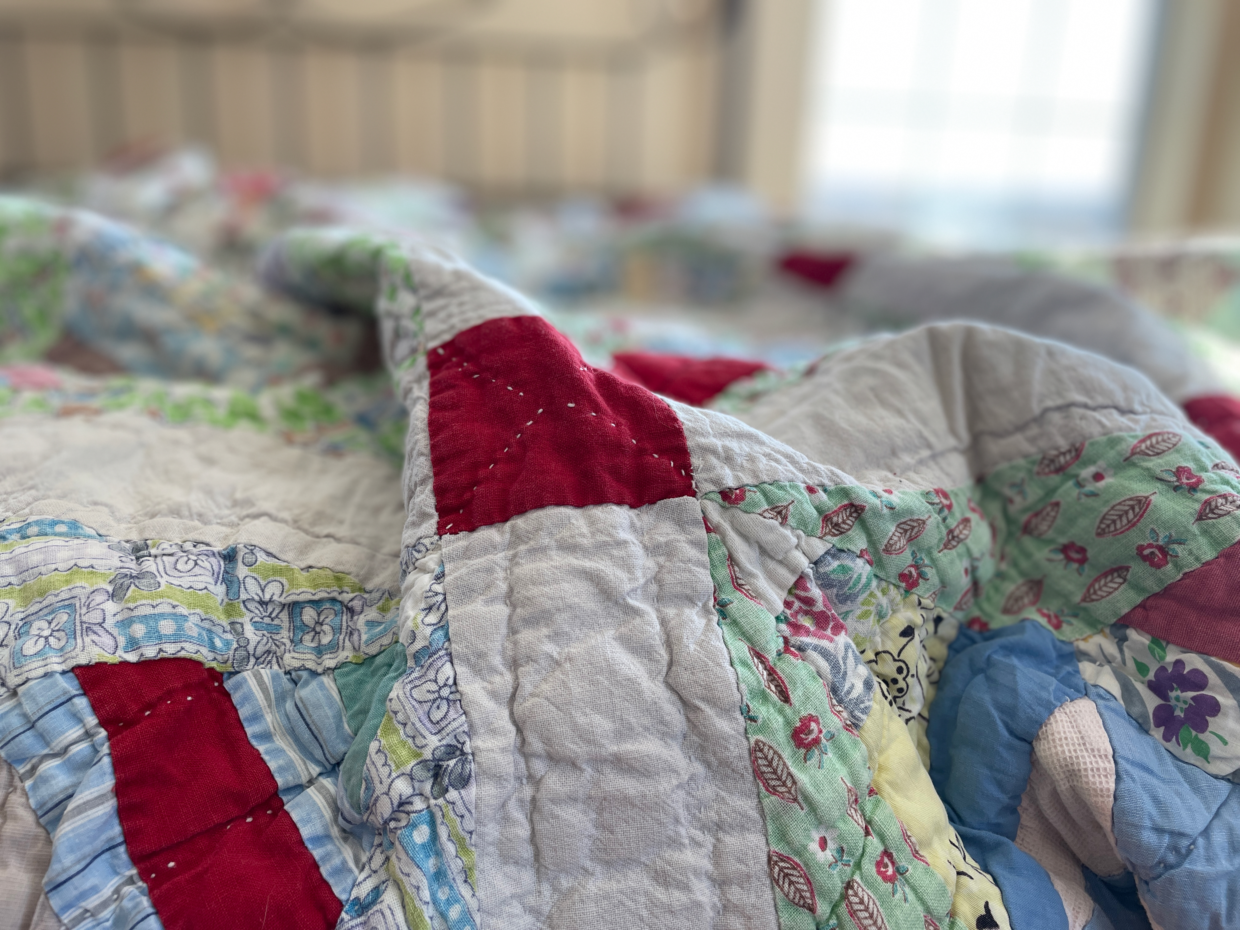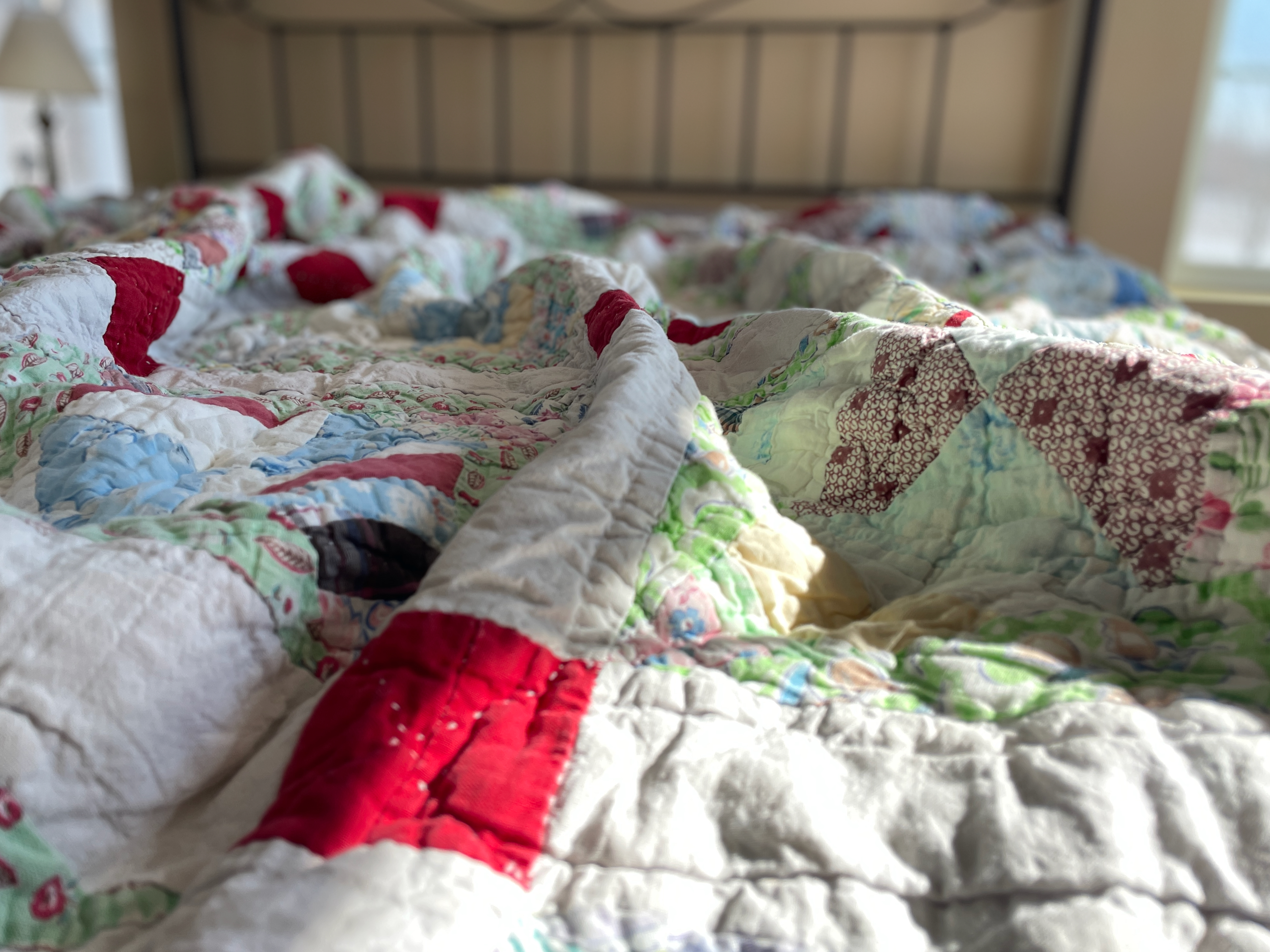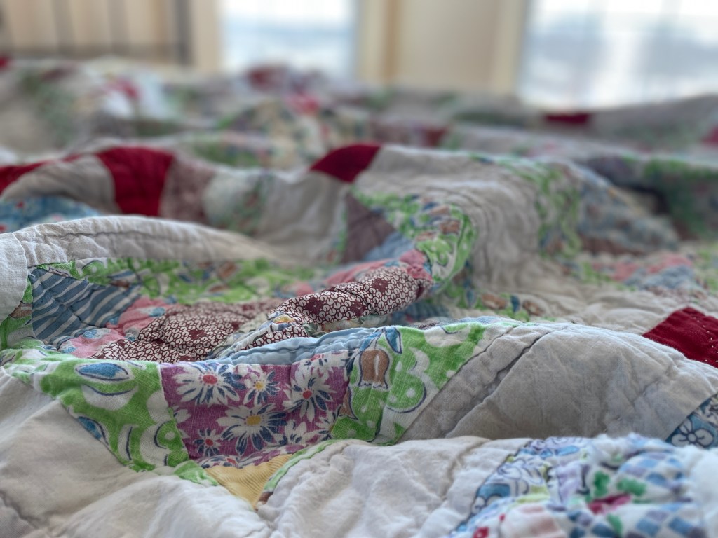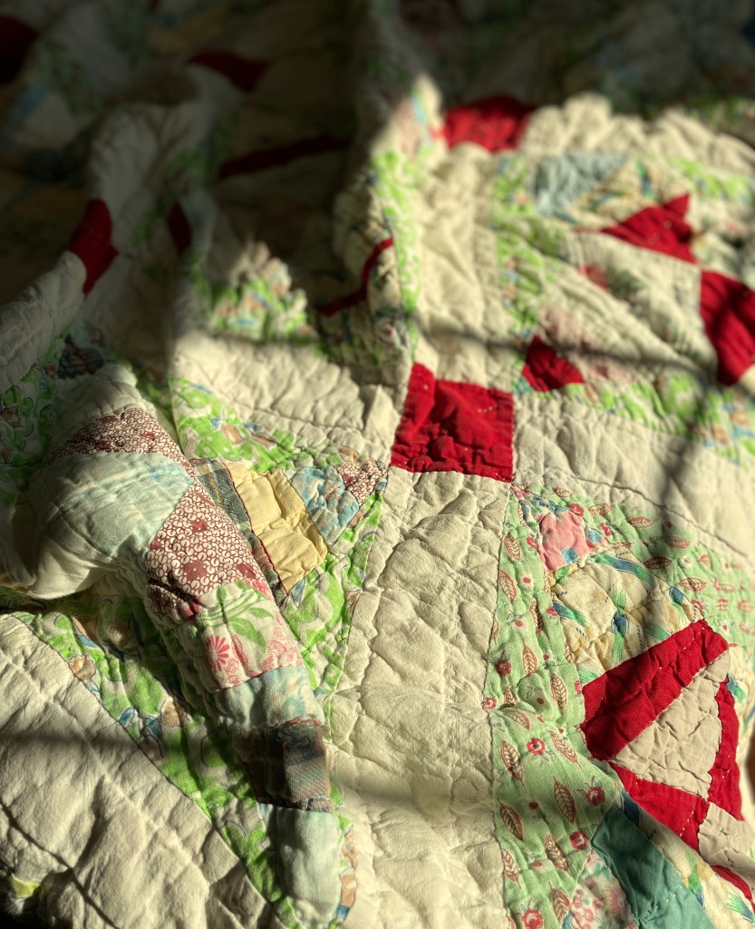 I remember taking naps on this already-old quilt on hot Alabama days. My mother would place it on the hardwood floor and turn an electric floor fan on me. I loved that fan, although I was also terrified of it — my mother’s repeated warnings ringing through my ears. That fan would cut off my fingers if I reached through the grill on the front — a grill with spaces plenty wide enough to allow curious preschool fingers to pass easily through to the heavy metal blades inside. Thankfully, I was more fearful than curious, and the mental image of my fingers lying on the floor in pools of blood kept my hands close to my sides. But I loved that fan from a distance, and even now, my breathing slows and my body relaxes as I close my eyes and hear the soothing hum of that fan mingled with the summer sounds drifting in through my open window. The chirp of crickets, distant yells of lucky neighborhood kids who had outgrown naps, the faint whack of a bat hitting a baseball somewhere on our street, the rhythmic thwock, thwock, thwock of my brother riding his bike with playing cards clothes-pinned to the wheel spokes. I remember that fan’s cool air blowing so effectively across my body that I would eventually wrap this quilt around me, burying myself in its cocoon before slipping into a peaceful sleep.