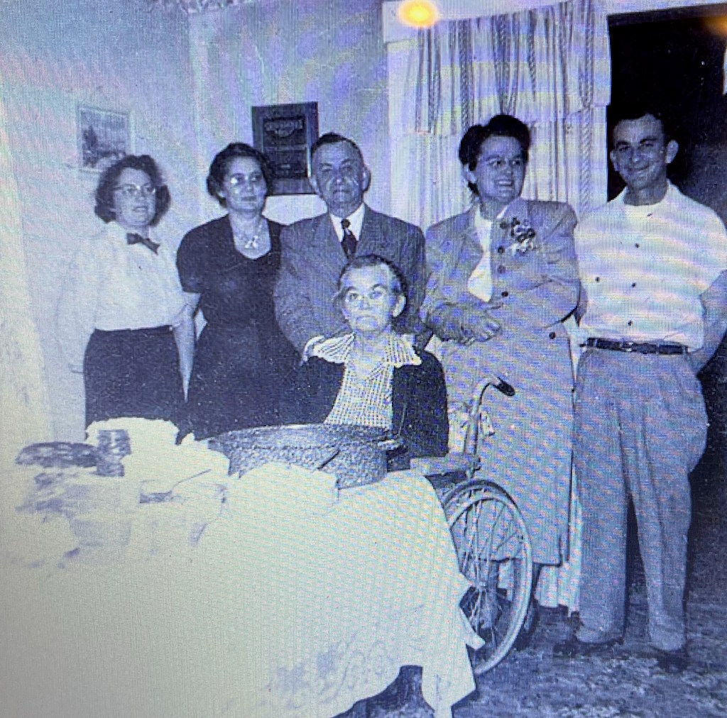 Grandma Crumly always seemed to me to be unhappy. Maybe even angry. I mostly kept my distance from her because the thought of doing anything to upset her made me quake in my scuffed, white patent Mary Janes. But I wonder now what she was really like. She had certainly been through so many hard times in her life. Robbed of the gift of walking, carrying a mother’s guilt over the horrendous death of her first precious baby. I was told that her husband Frank was a gentle, patient, and loving man. I was only four when he died, so I don’t remember.