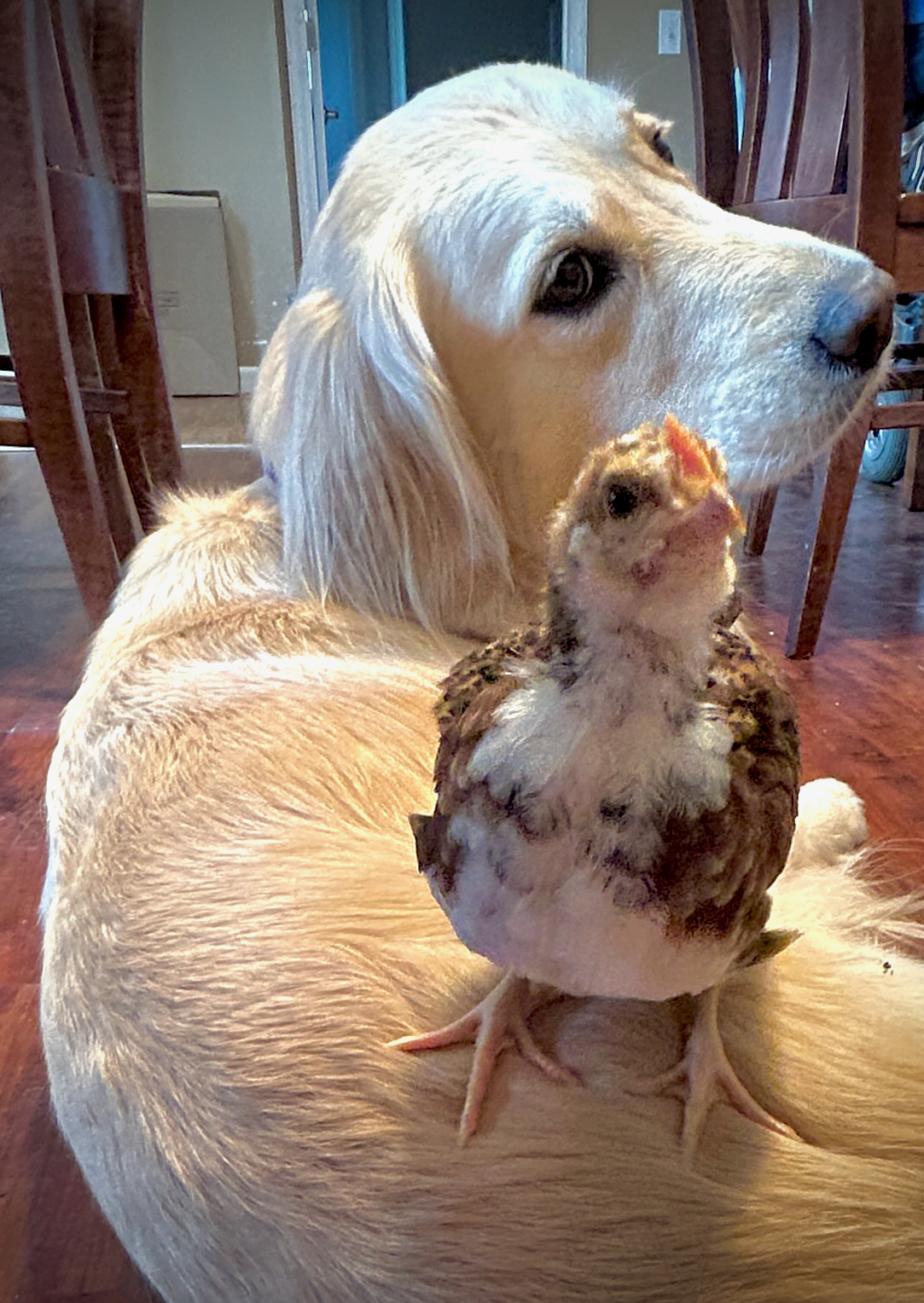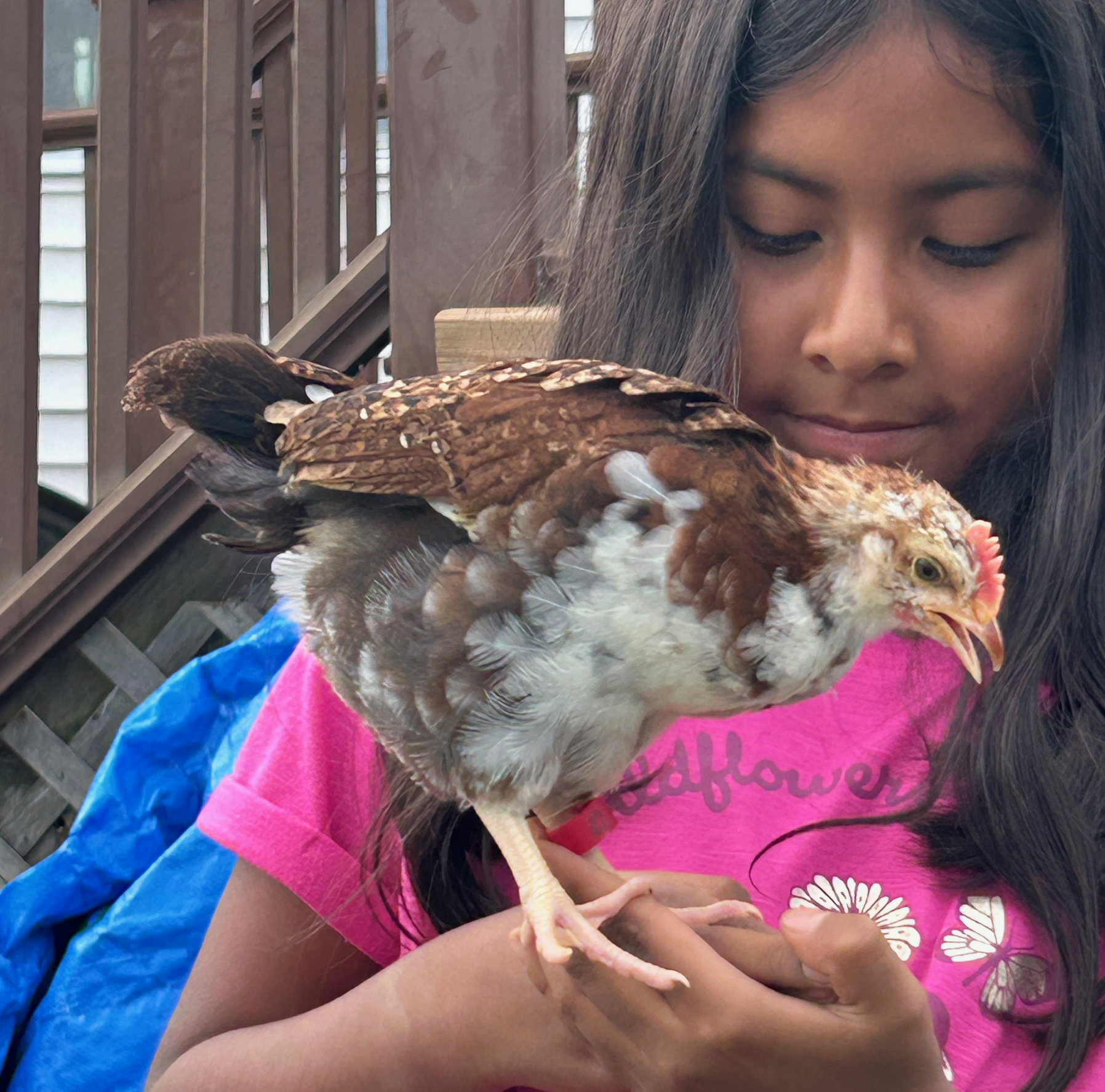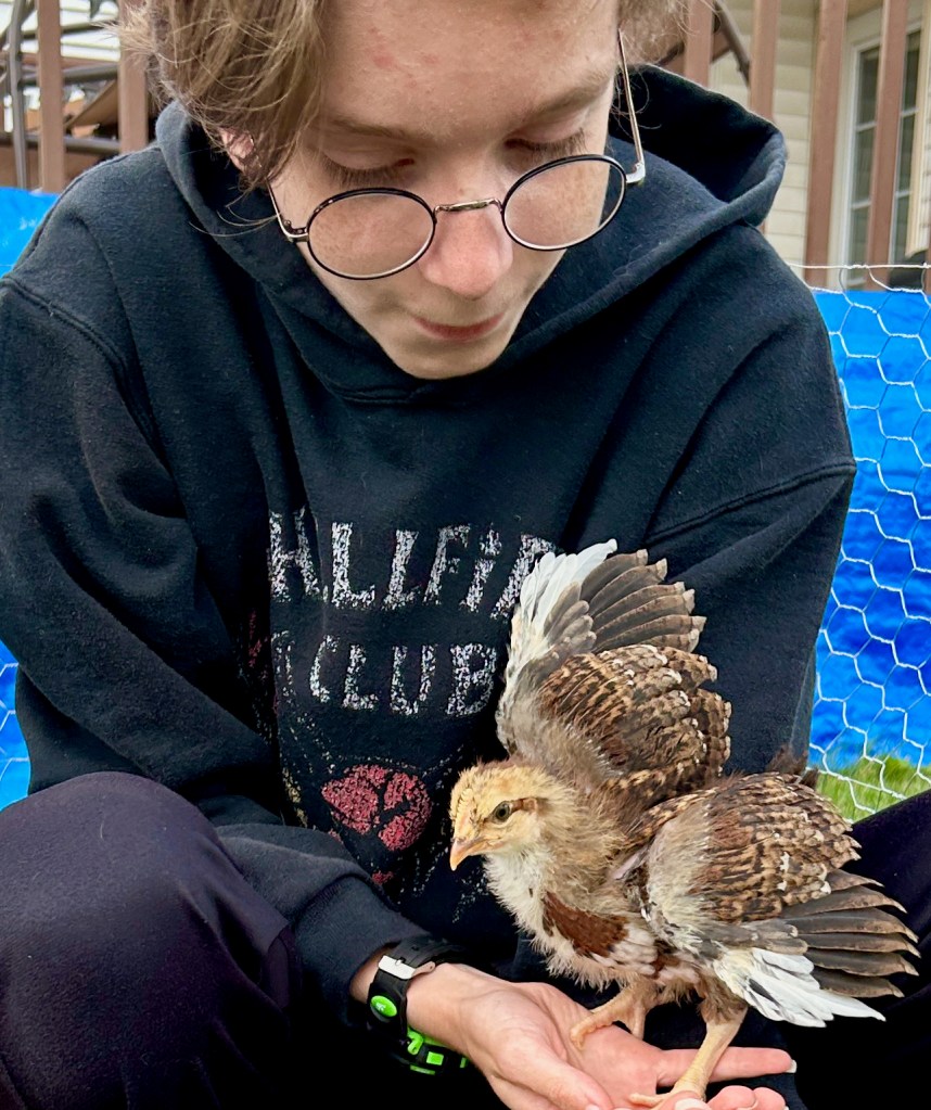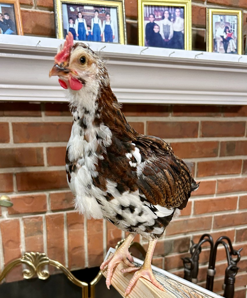 They are Speckled Sussex chickens, which are known to be social, more timid than other breeds, very sweet, and to make good pets. They have loved being snuggled (as you can see from the photos), and we will miss the fun and joy they have brought into our family for the past couple of months. Our golden retrievers, who both really adore these babies, will also miss them a lot. Enjoy the photo dump, including a few of our kids and grandkids with the chickens. I’ll update again when we have more news.