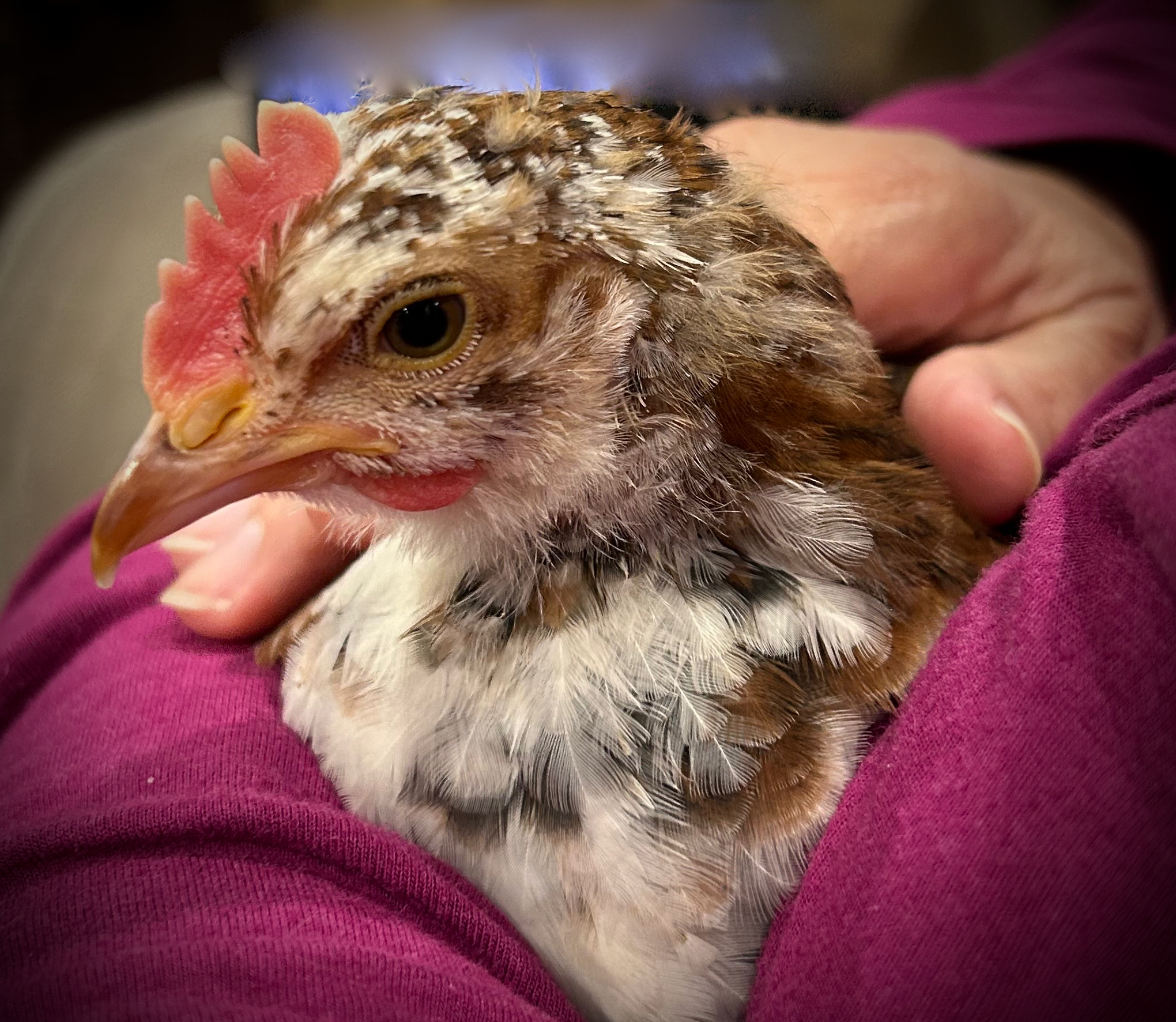 We had a little celebratory movie night as a family after we got my test results, and I spent time holding my “comfort chickens” on the couch during that movie. Comfort chickens? Maybe many of you don’t know about our temporary house guests. So I’ll also do a teensy update about them and include some photos as I close for now.