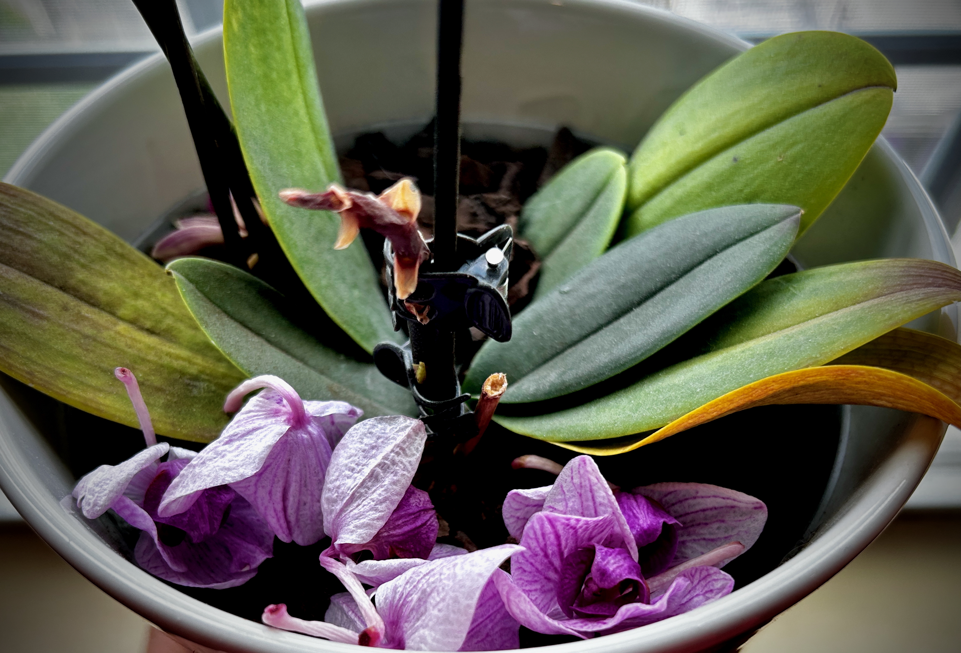 My beloved orchid just very suddenly and prematurely dropped it’s full and healthy blooms yesterday in, as my mother would say, “one fell swoop.” I’m not sure why, but it was almost as if they just got tired of holding on, and then let go. All of them at once. I can understand that feeling. The leaves also don’t look so great suddenly, though, so I’m not sure what caused this. Whatever the reason, it’s bare now and looks sad. Maybe it will come back eventually. It has before, so there is reason to hope.